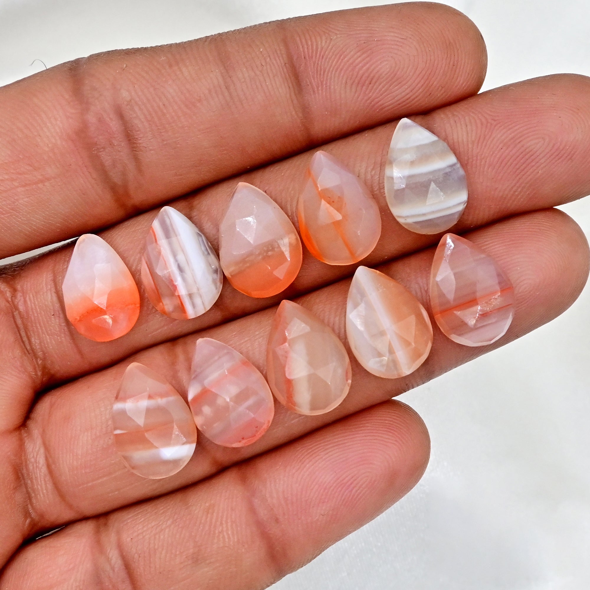 These Botswana Agate Pear Rose Cut Cabs are a celebration of earth’s slow artistry. Featuring flowing bands in shades of smoky grey, blush, ivory, and soft peach, each stone tells a quiet, grounding story. Perfect for bespoke jewelry that leans into organic elegance.