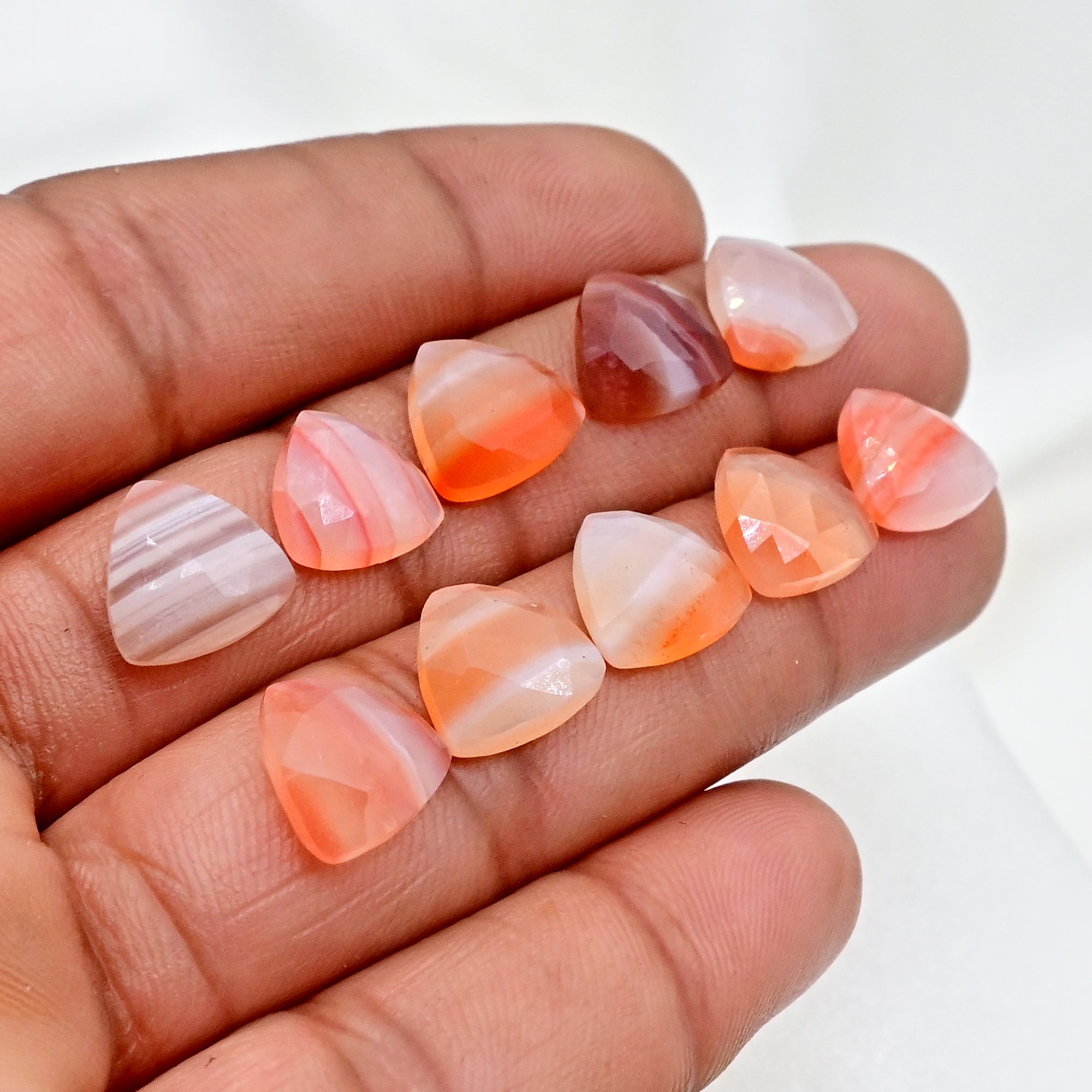 These Botswana Agate Trillion Rose Cut Cabs are a celebration of earth’s slow artistry. Featuring flowing bands in shades of smoky grey, blush, ivory, and soft peach, each stone tells a quiet, grounding story. Perfect for bespoke jewelry that leans into organic elegance.