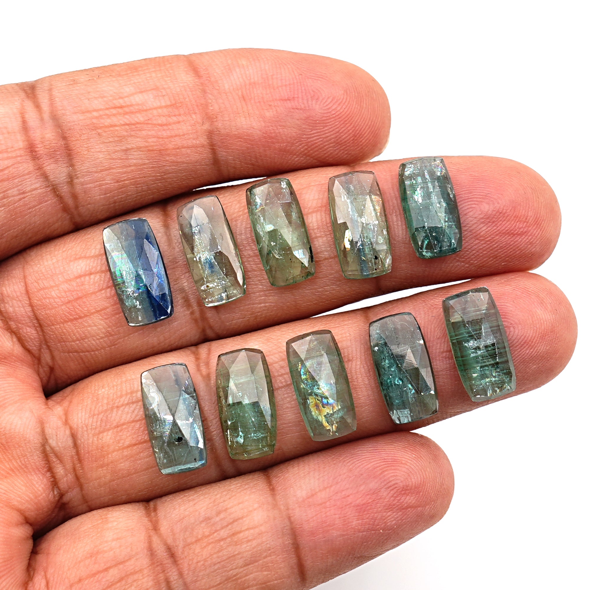 A rare parcel of Emerald Green Kyanite rose cut cabochons—where earthy depth meets crystalline clarity. Each piece reflects the raw, grounded beauty of nature with deep teal tones and mossy inclusions.