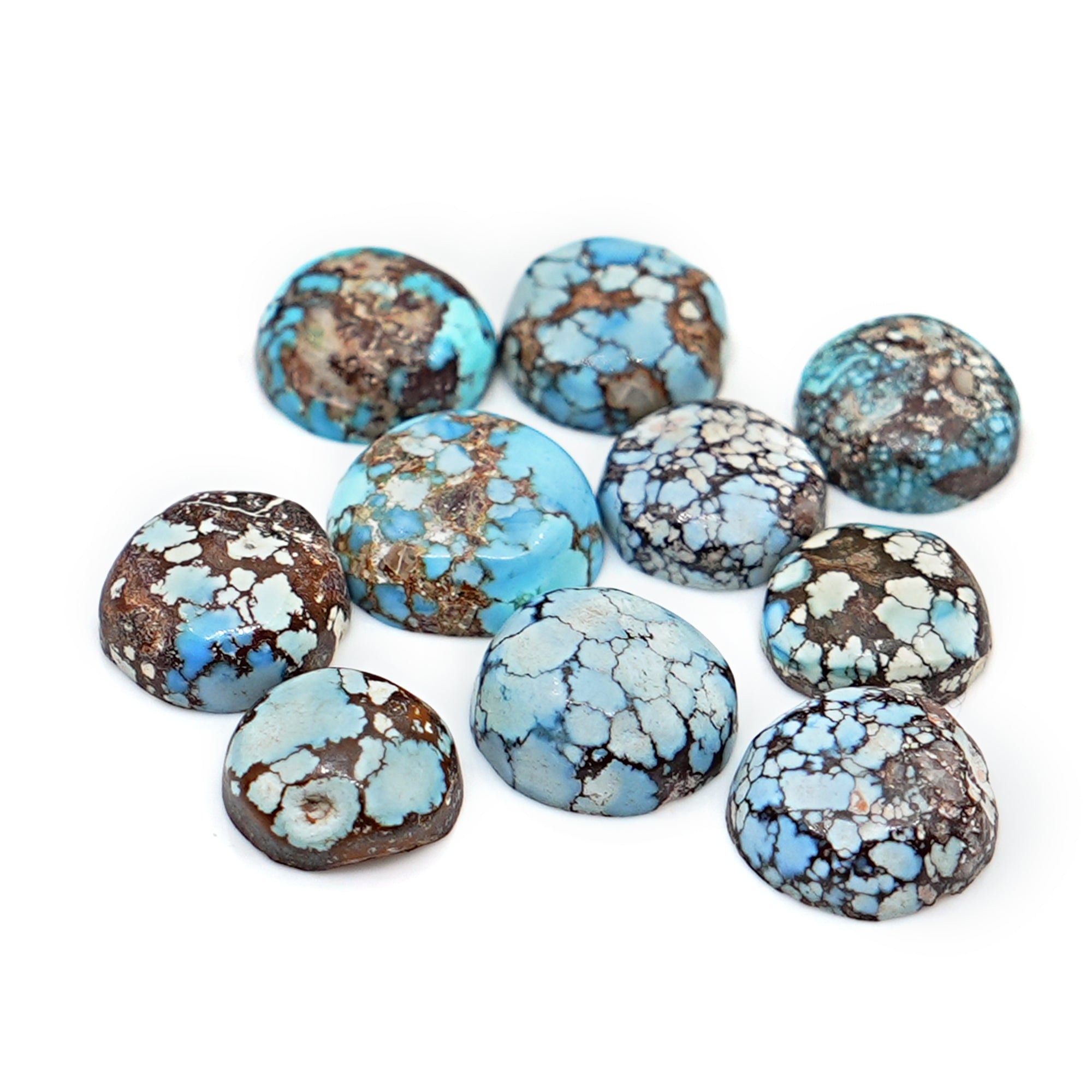 Dive into a captivating palette of natural sky blues and earthy matrix patterns with these Golden Hill Turquoise cabochons. This parcel offers an artisanal mix of round and freeform cuts — each piece echoing the uniqueness of its natural origin.