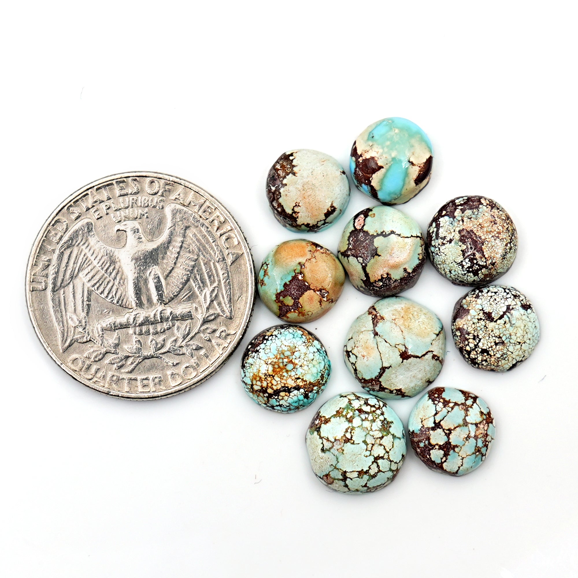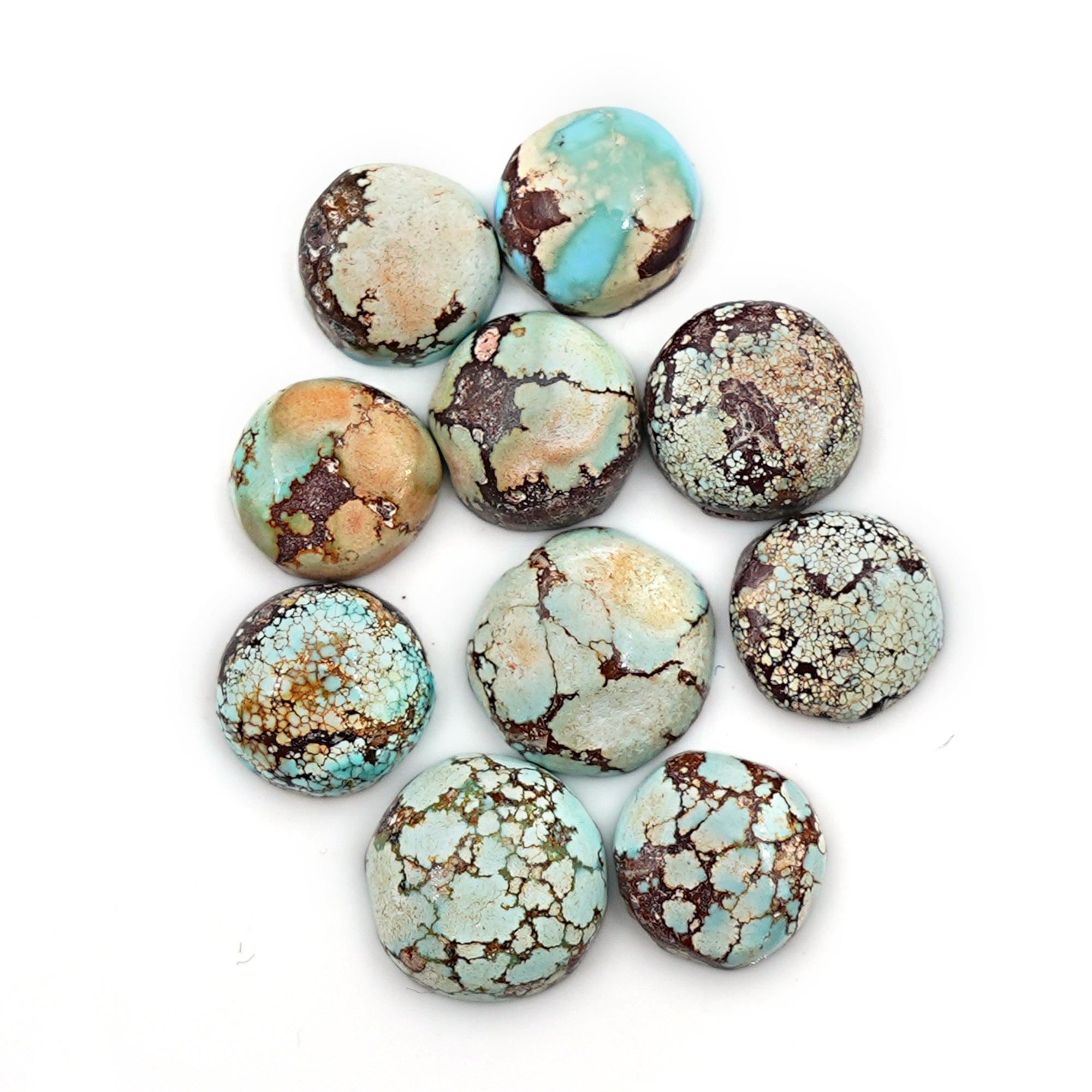 A collector’s delight — this set of Golden Hill Turquoise round cabochons brings together rich sky blue hues, occasional soft lavender undertones, and intricate natural matrix patterns. These stones are prized for their exceptional color clarity and rarity.