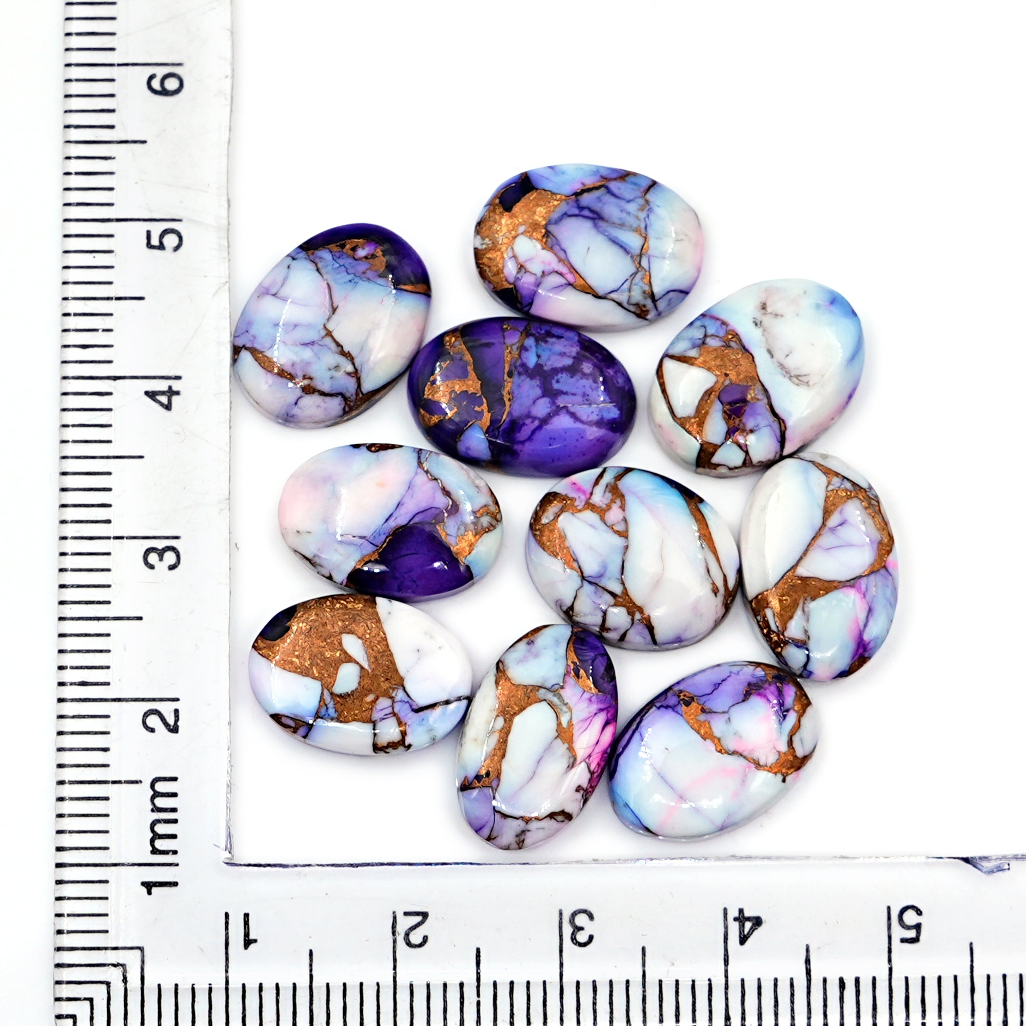 These Kingman Purple Dahlia Mohave Turquoise Cabochons are a vibrant fusion of Violet, coppery gold, and bold turquoise veins. The Mohave turquoise matrix with copper highlights makes them especially popular for bohemian, southwestern, and statement jewelry.