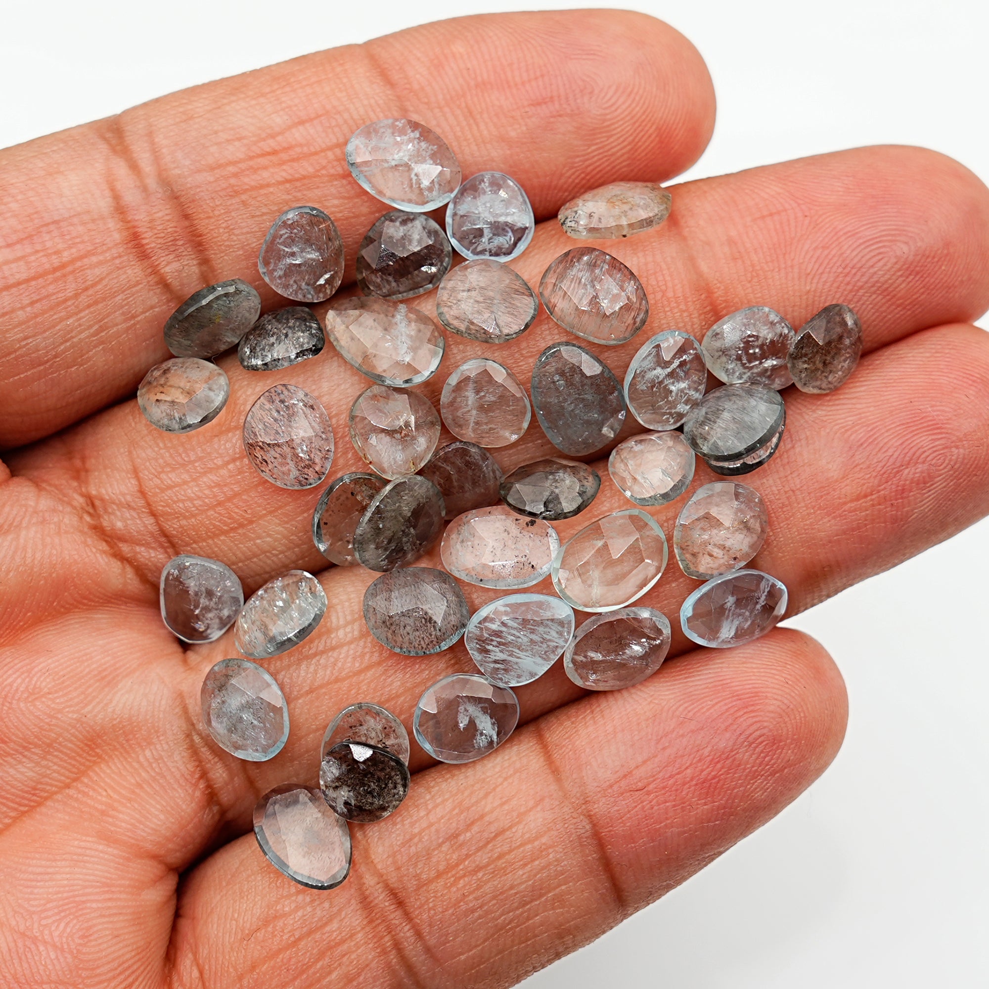 These Moss Aquamarine Rosecut Cabochons, misty blue hue with delicate moss-like inclusions that give them a dreamy, oceanic depth. Each stone is shaped in a freeform silhouette and topped with light-catching faceted rosecut surfaces.