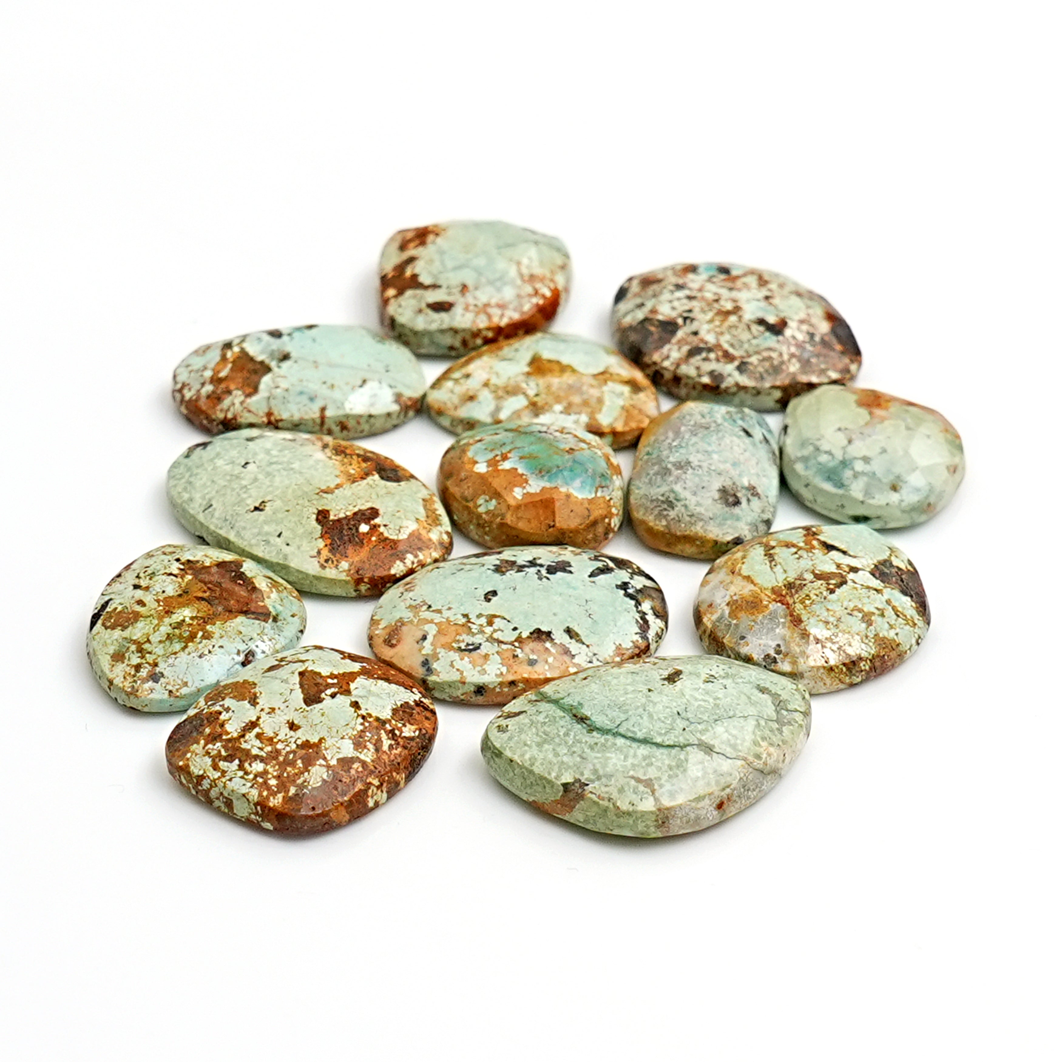 This curated set of Nevada Turquoise Rosecut gemstones features organic freeform shapes with glimmering facets. Each stone is a celebration of raw elegance. Perfect for bold rings, rustic pendants, or nature-inspired artisan collections.