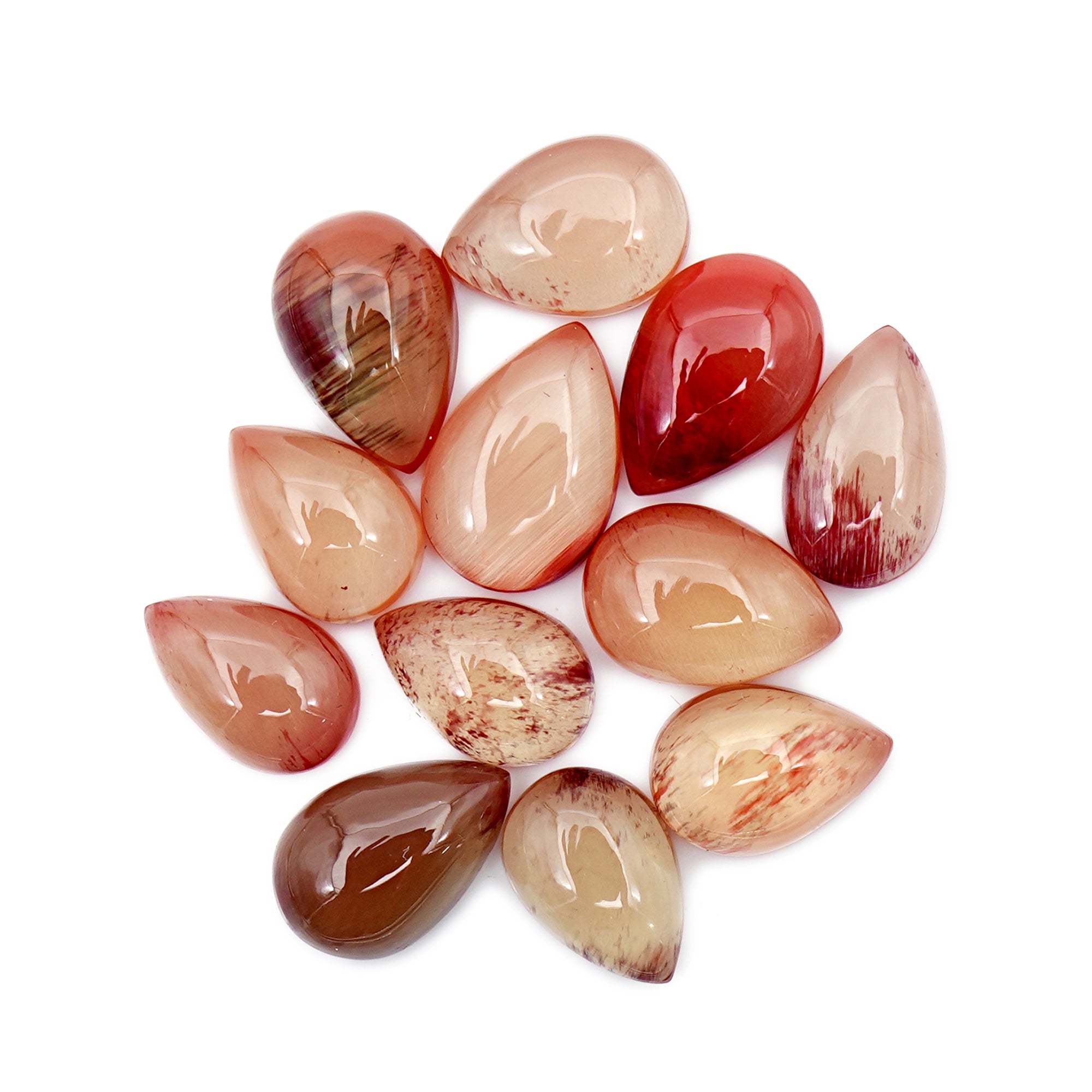 These shimmering Andesine Cabochons offer an enchanting mix of warm, fiery tones—ranging from golden reds to subtle oranges. Each cabochon is hand-polished and features a faceted surface with a flat back, making them ideal for bezel settings in rings, earrings, or pendants.