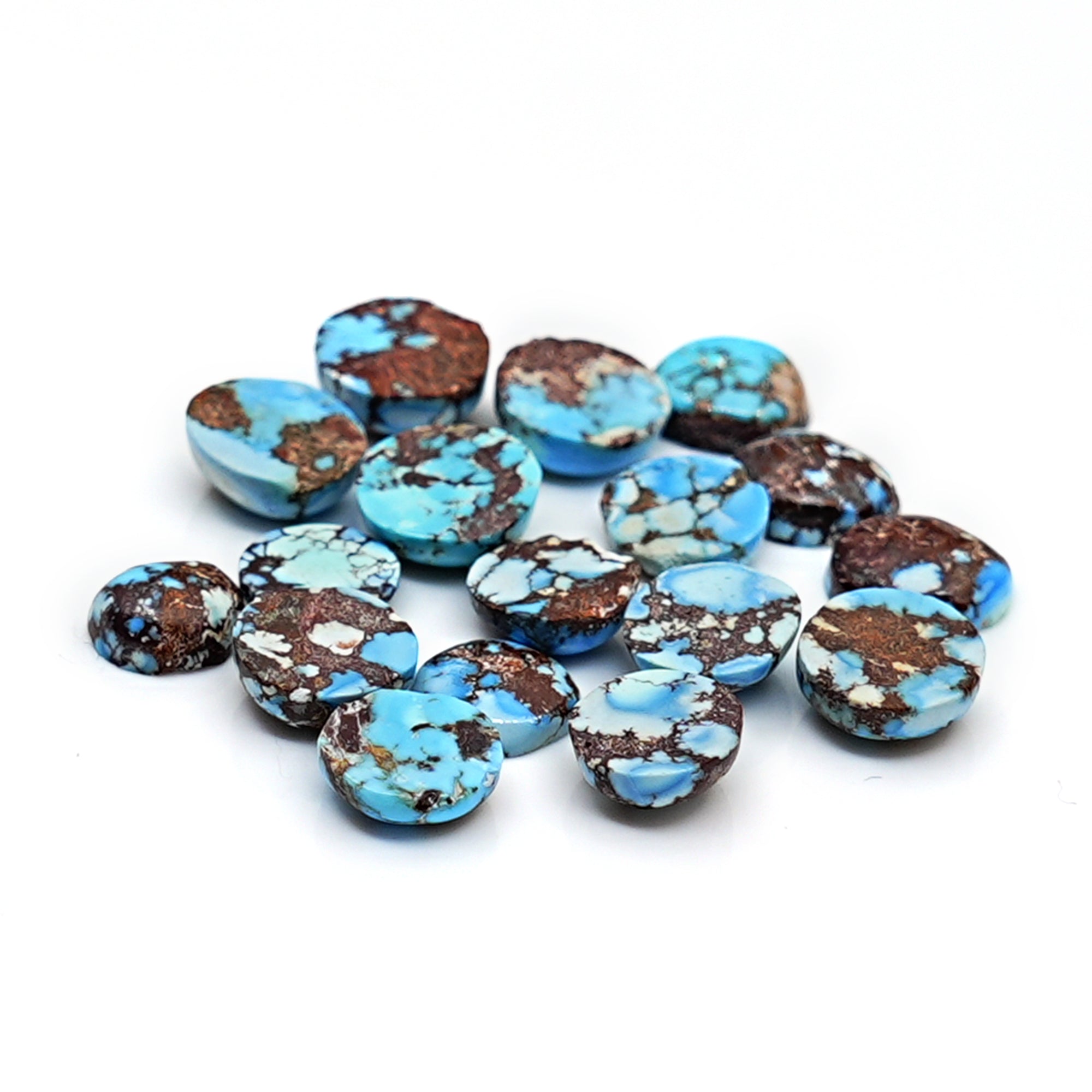 A rare find from the famed Golden Hill mines of Kazakhstan, these round cabochons boast the signature lavender-blue tone with delicate matrix patterns that set this turquoise apart. A perfect choice for elegant studs, charms, or minimal rings.