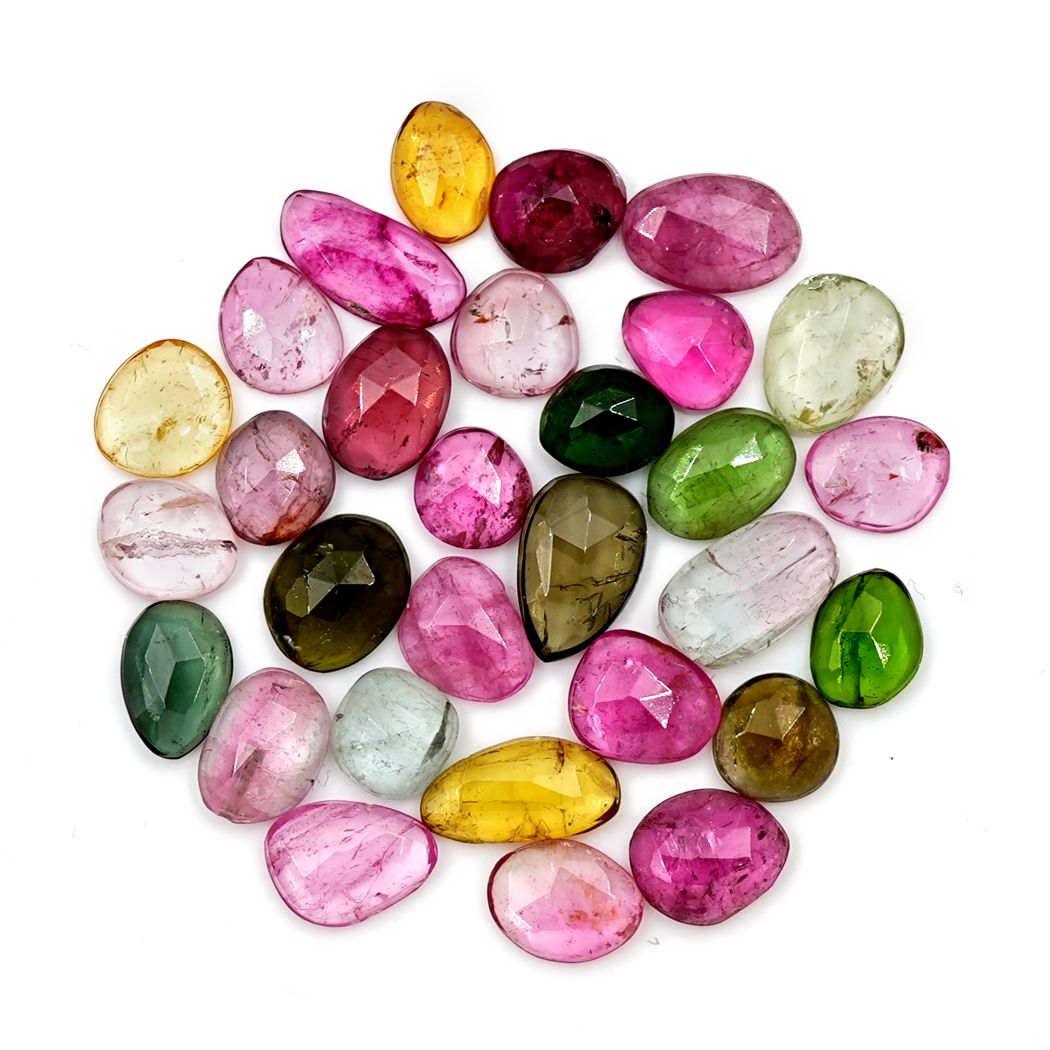 A soft shimmer, a raw edge, and colors pulled straight from the earth—add a touch of raw elegance to your designs with these natural tourmaline rosecut cabochons. Cut in organic freeform shapes, each piece showcases earthy hues and inner depth unique to tourmaline.